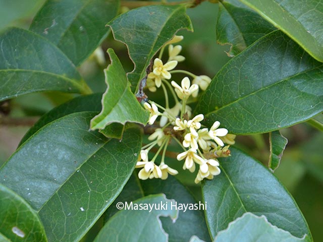 6:ウスギモクセイの花は薄黄色で、濃淡は個体差がある。秋以外に春などにもしばしば開花し、「四季咲きモクセイ」の名で植えられることも増えている。野生のウスギモクセイは中国のほかに九州南部にもある。