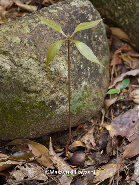 10:日本最大級のどんぐりをつけるオキナワウラジロガシ(沖縄裏白樫)の芽生え。沖縄県に分布し、どんぐりは長さ3cm以上にもなる。
