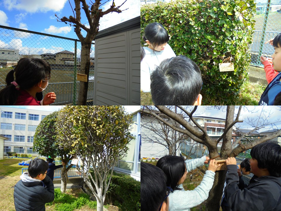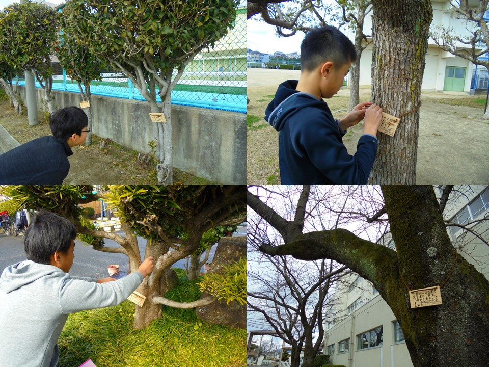 2月27日(木)に高槻市立真上小学校6年生の皆さんと先生に、樹木名プレートの作成と設置をしていただきました。