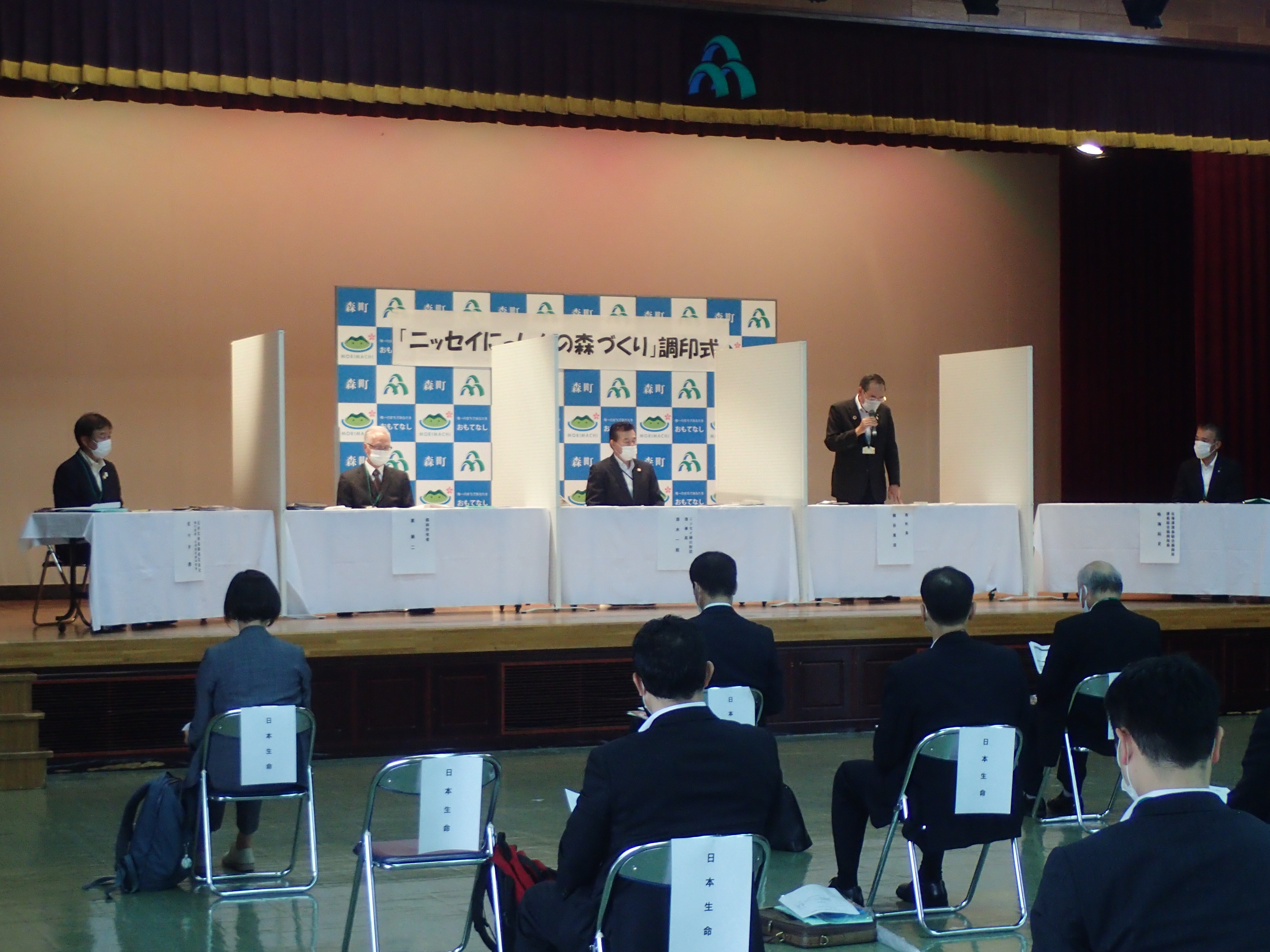 北海道森町で”ニッセイにっしんの森”の森づくり調印式が行われ,ニッセイの森200箇所を達成いたしました!