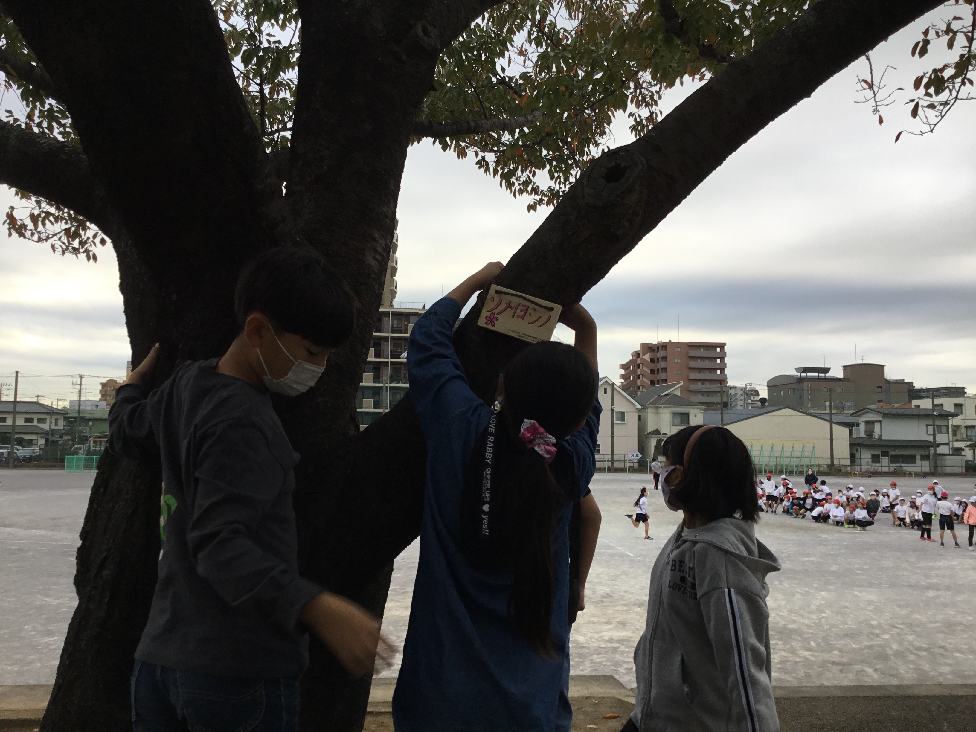 12月2日に平塚市立松原小学校の4年生の児童の皆様に「松原小学校の木のしおり」を活用した自然観察会及び樹木名プレート(樹木板)の設置を行っていただきました。